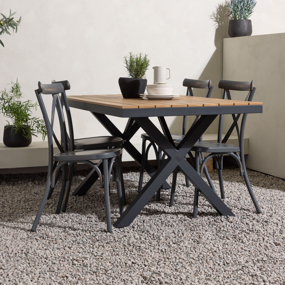 En kaxig svart matgrupp i Skandinavisk design - perfekt för din uteplats! Vårt rektangulära matbord Garcia har en klassisk design med en bordsskiva i vacker Aintwood och kryssade bordsben i svart aluminium. Här i matchande kombination med 4st av våra moderna matstolar från serien Tablas. Stolen har en industriell stil och är tillverkad i slitstarkt aluminium i en sotig svart färg. Skapa ett blickfång som imponerar och sitt bekvämt i sommar! Bordets mått: 150x90cm.