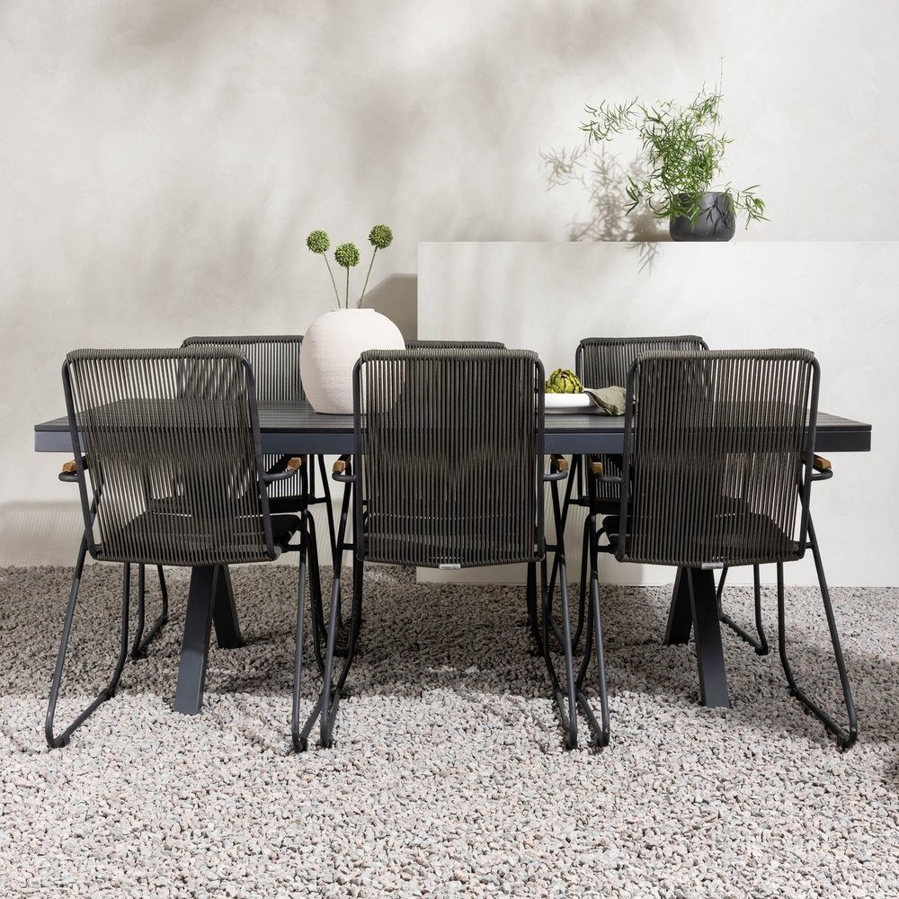 Trendigt, slitstarkt och smart - en matgrupp med alla rätt! Vårt rektangulära matbord Garcia har en klassisk design med en bordsskiva i svart Aintwood och kryssade bordsben i svart aluminium. Här i unik kombination med mörkgråa matstolar från serien Bois. Stolen har en bekväm design med armstöd i teak, ram i svart stål och sits i mörkgrått rep. Den genomtänka kombinationen ger dig en personlig matgrupp som står sig över tid! Bordets mått: 200x100cm.