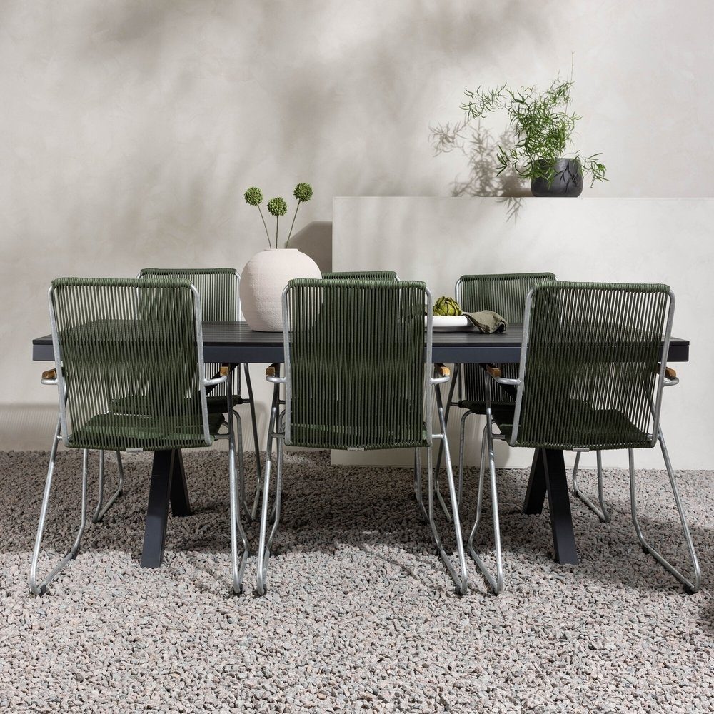 Bryt av alla enkla färger med en poppande färgkombination - här får du en matgrupp som imponerar! Vårt rektangulära matbord Garcia har en klassisk design med en bordsskiva i svart Aintwood och kryssade bordsben i svart aluminium. Här i unik kombination med gröna matstolar från serien Bois. Den här stolen har en bekväm design i zinkkonstruktion, sits i smäckert grönt rep och dekorativa armstöd i teak. Matgruppen är utomhustålig och passar lika bra på altanen som i uterummet! Bordets mått: 200x100cm.