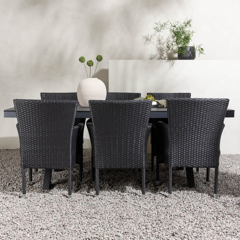 Med den här matgruppen kan du enkelt möblera uterummet eller altanen modernt och bekvämt! Vårt rektangulära matbord Garcia har en klassisk design med en bordsskiva i svart Aintwood och kryssade bordsben i svart aluminium. Matstolarna tillhör serien Malina och står sig garanterat över tid. Stolen har en stomme i aluminium och är klädd i flätad, svart konstrotting. Bjud in till många härliga måltider utomhus framöver! Bordets mått: 200x100cm.