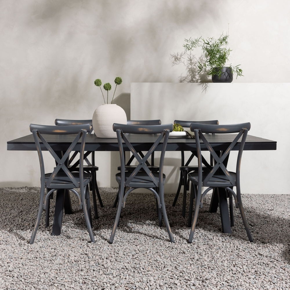 En kaxig svart matgrupp i Skandinavisk design - perfekt för din uteplats! Vårt rektangulära matbord Garcia har en klassisk design med en bordsskiva i svart Aintwood och kryssade bordsben i svart aluminium. Här i matchande kombination med våra moderna matstolar från serien Tablas. Stolen har en industriell stil och är tillverkad i slitstarkt aluminium i en sotig svart färg. Skapa ett blickfång som imponerar och sitt bekvämt i sommar! Bordets mått: 200x100cm.