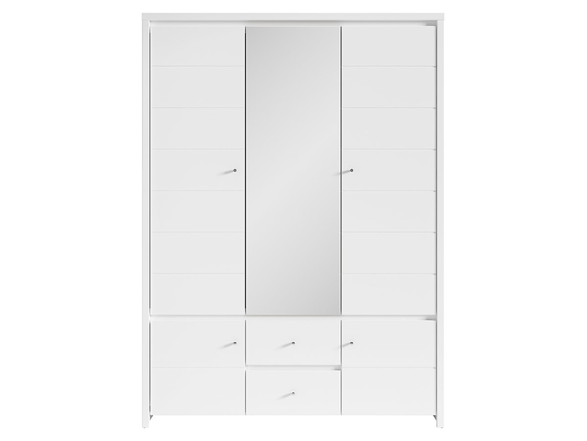 En rymlig garderob i vitt med silvriga knoppar. Garderoben har tre dörrar och är väldigt funktionell. Undertill finns det två lådor och två mindre skåp för förvaring av mindre föremål. Dörren i mitten är en spegel och inuti garderoben finns en praktisk klädstång och många hyllplan.
