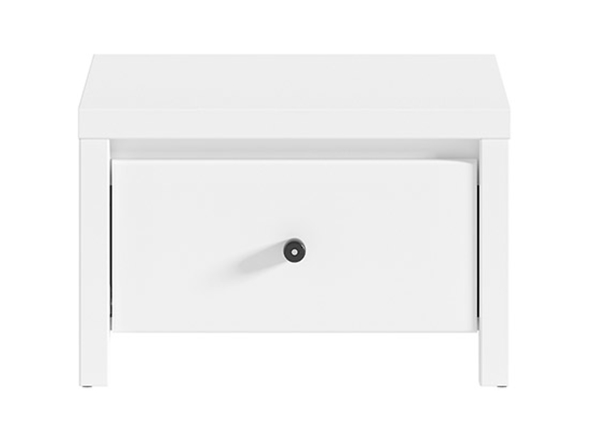 Ett fint och stilrent sängbord i vitt med svarta knoppar. Sängbordet har en låda och en bra avställningsyta uppe på.