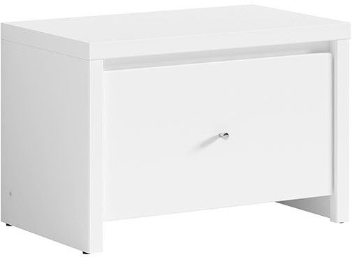 Ett praktiskt skoskåp i vitt med silvriga knoppar. Skåpets dörr öppnas nedåt vilket gör det enkelt att komma åt skorna. Då skåpet är litet passar det även i de mindre hallarna.