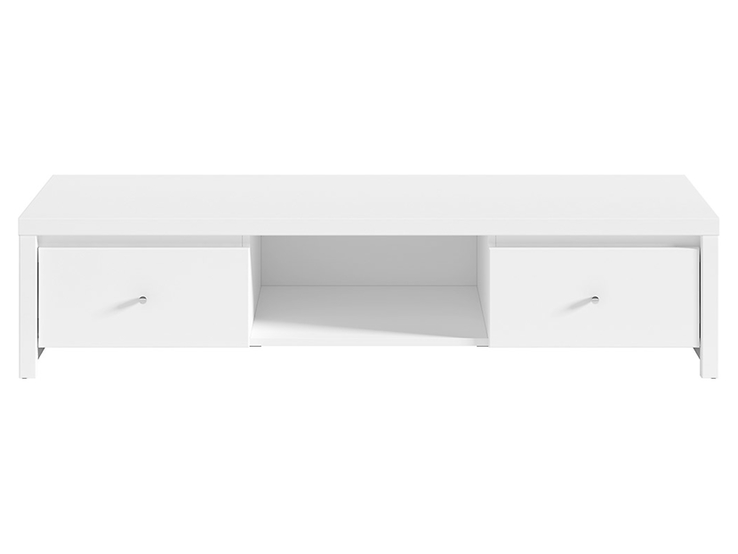 En fin mediabänk i vitt med silvriga knoppar. Mediabänken har två lådor och ett öppet fack i mitten. Med de förborrade hålen på baksidan kan du enkelt få ordning på kablarna men de fungerar också som ventilation åt den elektronika utrustningen.