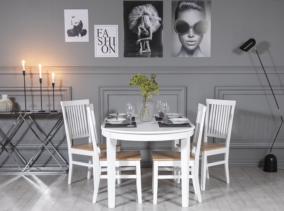 Gåsö matgrupp: Bord 160/210 cm inklusive 4 Fårö stolar - Ek/vit: