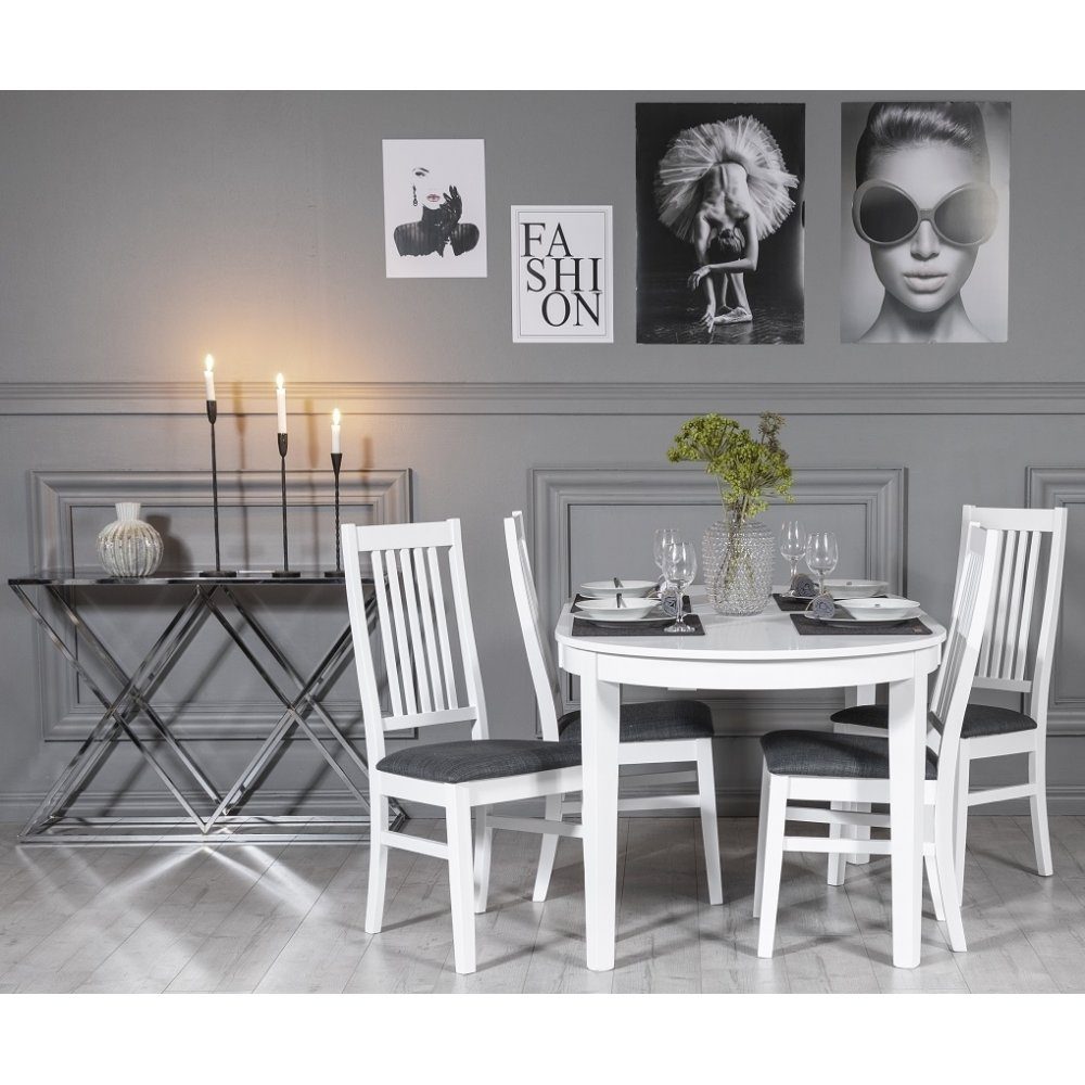 Klassiskt matgrupp, bord med underrede och toppskiva av massivt vitlackat trä. Modern stol i massivt heveaträ, vitlackad med sits av grått tyg.