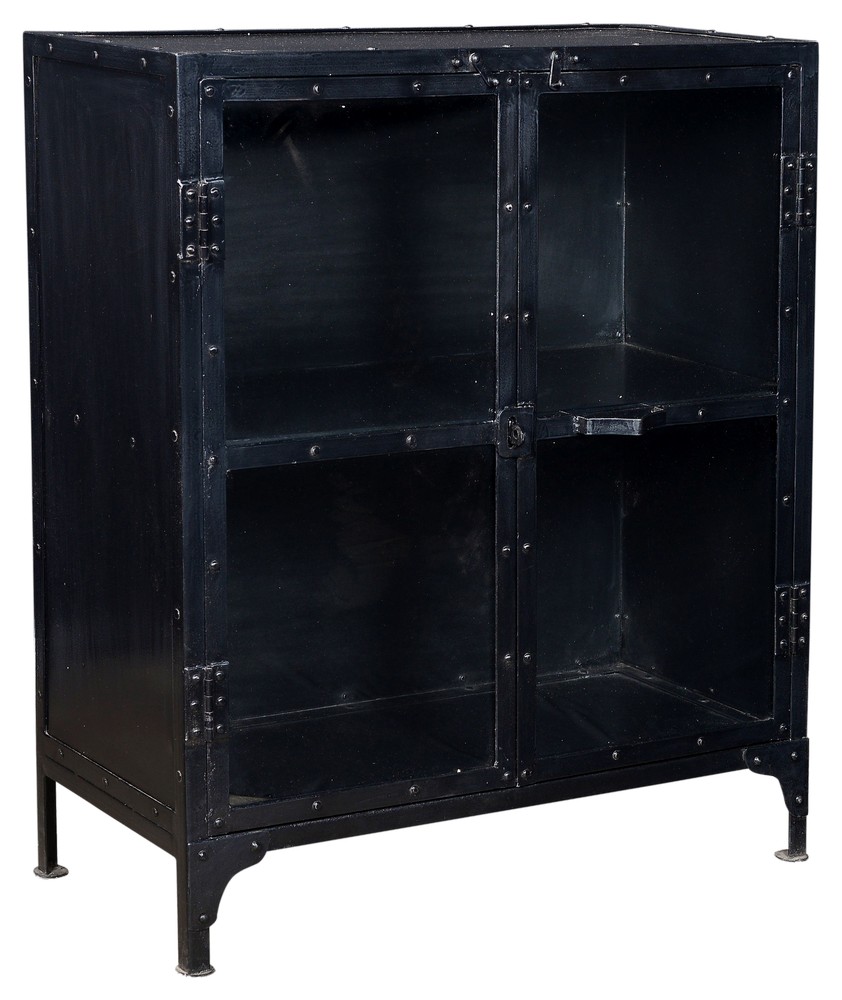 Robust skåp i svart metall och två glasdörrar. Passar bra om man har prydnadssaker man vill förvara synliga på ett snyggt sätt. Varje skåp är unikt och kan därför skilja i finish.