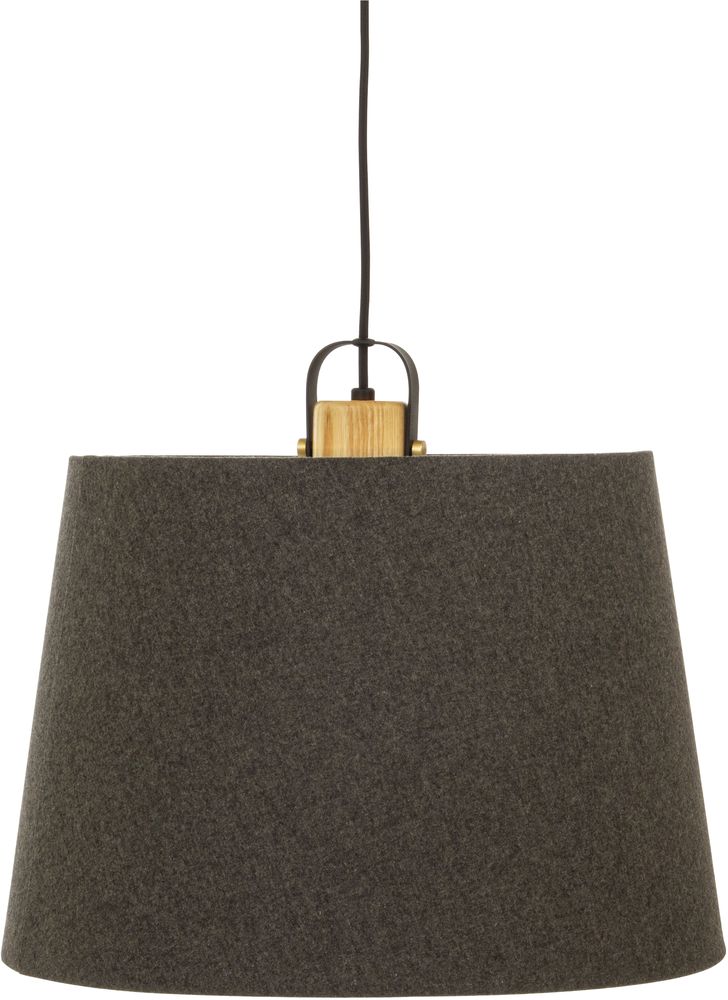 Taklampa i svart metall med detaljer i naturligt trä och grå lampskärm i textil. Monteras lätt på plats i taket.