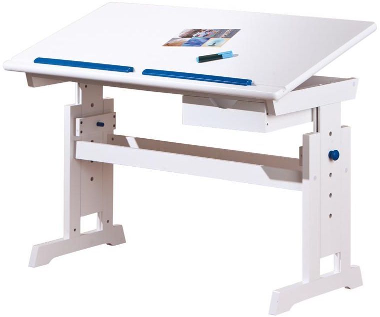 Ett praktiskt skrivbord med en stilren design. Underredet är tillverkat av vitlackerad massiv trä och bordsskivan är av vit MFP (premium träskiva) med detaljer i blått. Bordet är höj- och sänkbart och bordsskivan kan vinklas. En praktisk underhylla för smart förvaring av pennor m.m.