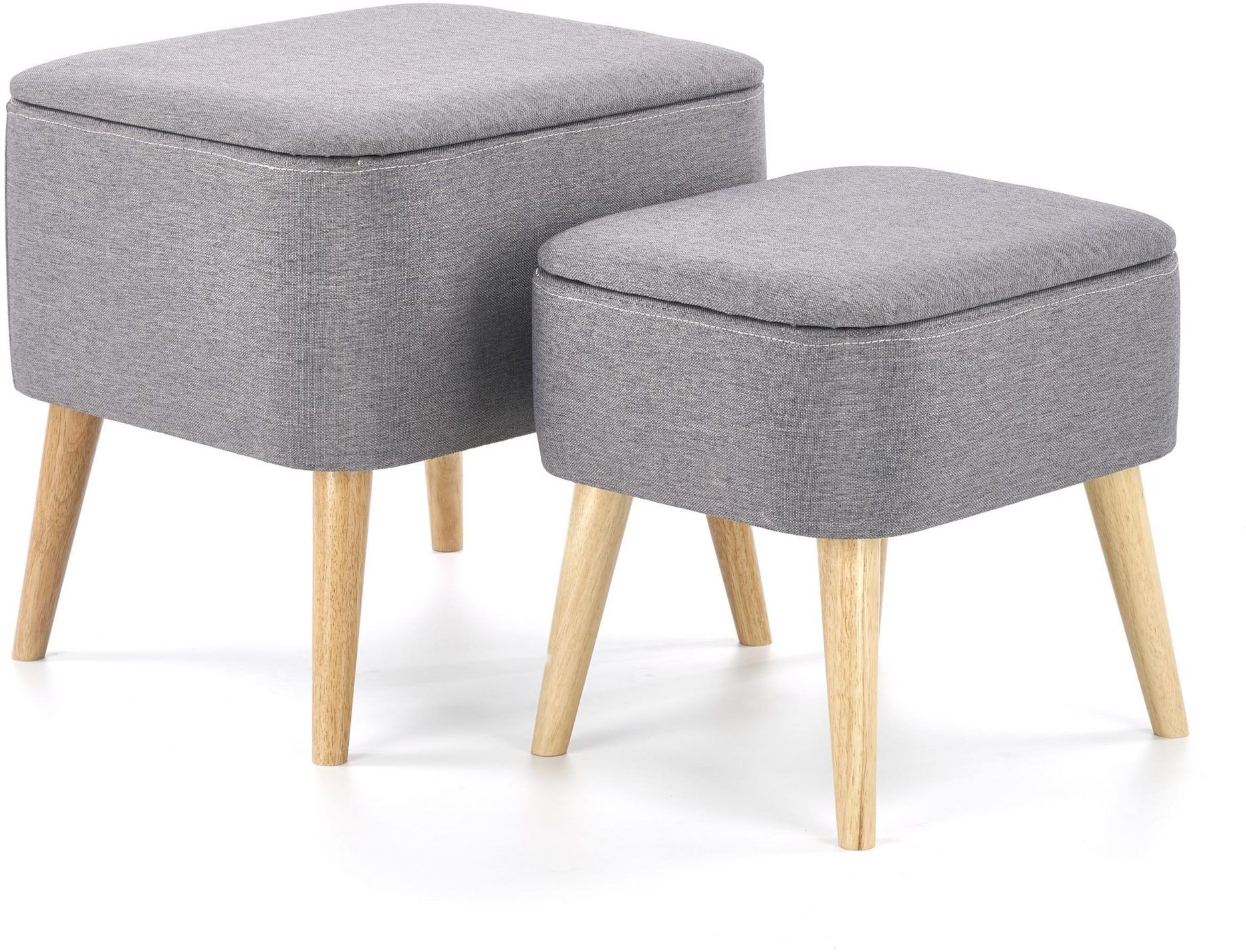Ett härlig pallset om två pallar med förvaring. Pallen är tillverkad av solid trä med dess naturliga look på benen och sitsen är klädd med ett mycket behagligt tyg för maximal komfort.