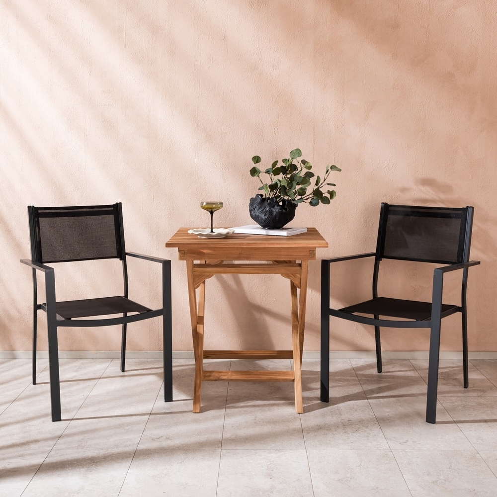 Stilrent, smart och minimalistiskt - en fikaplats som förgyller sommaren! Matbord Ghana har en nätt design i vacker teak och är hopfällbart för praktisk förvaring och förflyttning. Här tillsammans med stapelbara stolar från serien Copacabana i svart textilene. Stolarna har raka nordiska former och en mjuk komfort. Skapa en inbjudande plats på din altan!