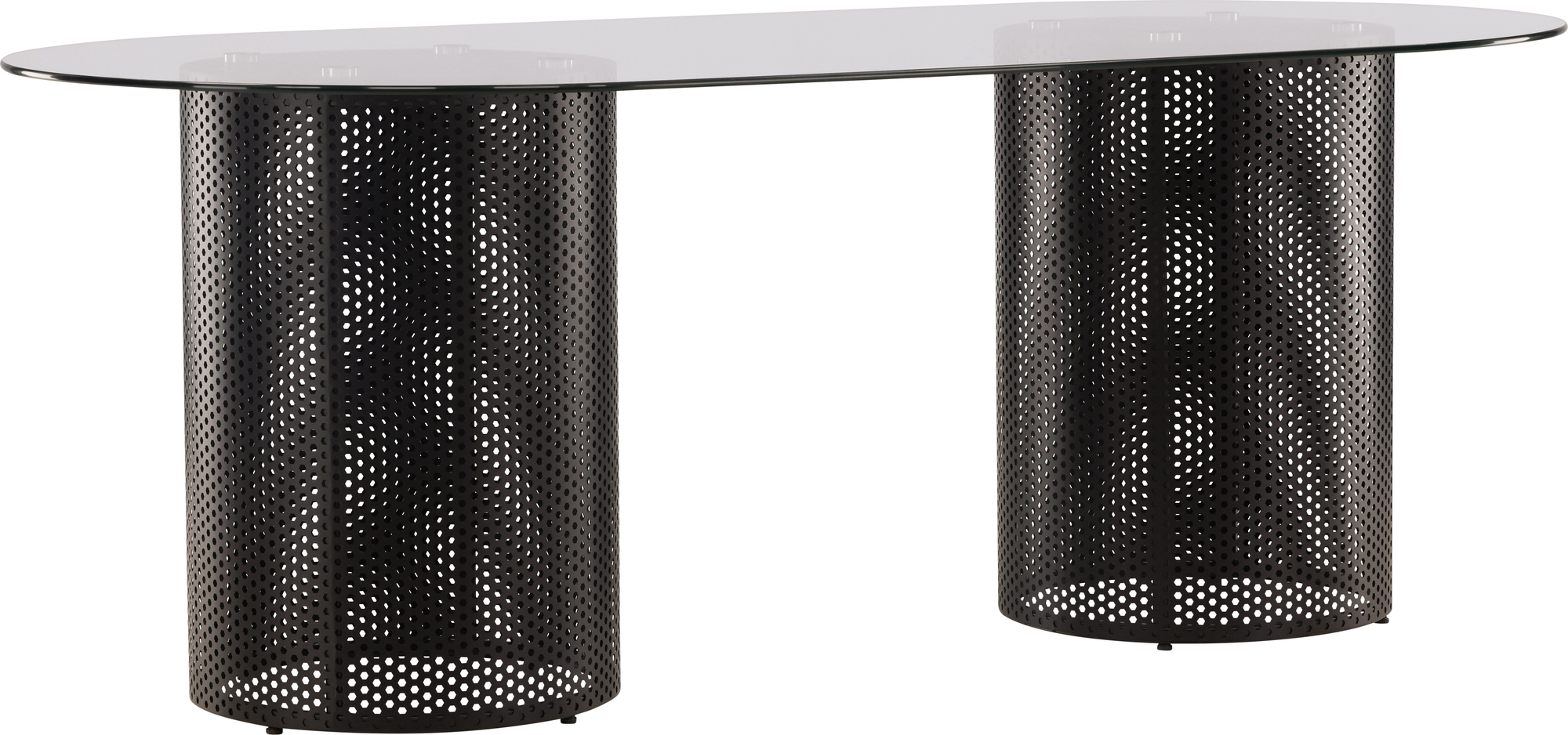 Det moderna matbordet som imponerar. Det här matbordet tillhör Lustig kollektionen och är lika genomtänkt som iögonfallande. Bordsskivan är oval i klarglas vilket ger en lyxig elegans till helhetsintrycket. De två cylinderformade benen är robusta i svart stål och har en smakfull industriell design som drar blickarna till sig. Matcha med ett par snygga matstolar så får du en komplett matgrupp till framtida måltider.