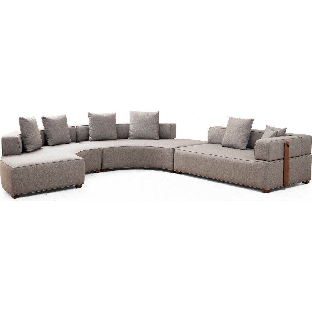 Soffa av trä med klädsel av polyester. Ställbart ryggstöd. Fasta sitt- och ryggdynor och ett tyg som kan kemtvättas. 7 st prydnadskuddar ingår.