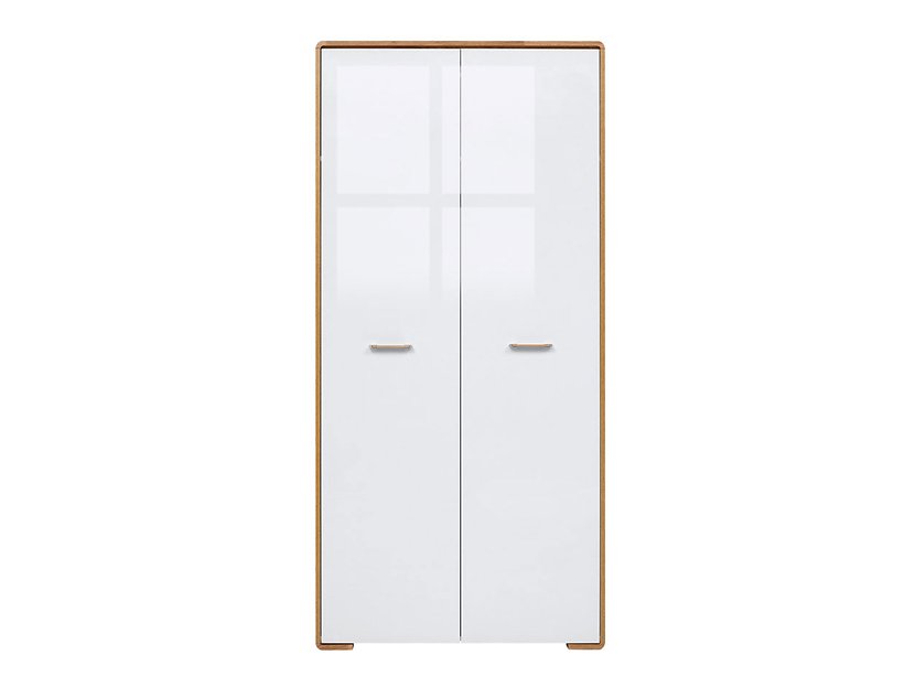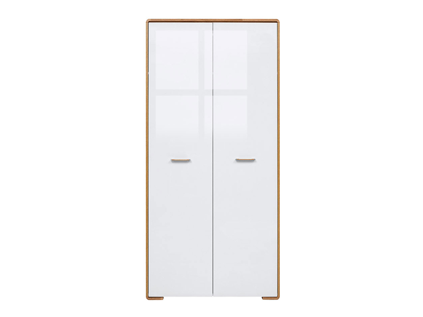 En snygg garderob med två dörrar. Garderoben är vit med snygga ekdetaljer. Inuti finns en praktisk klädstång med en hylla ovanför så att du på ett enkelt sätt kan hålla ordning på dina kläder.