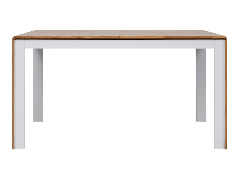 Ett snyggt matbord med vita ben och en bordsskiva i ek. Eken går även ner som en linje på benen och utgör en snygg detalj. Bordet har en inläggskiva som enkelt kan sättas dit vid behov.