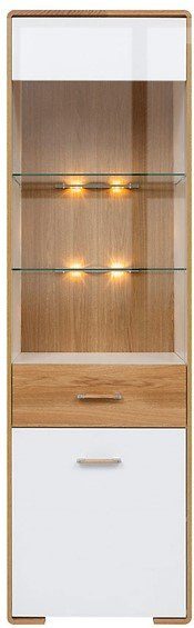 Ett fint skåp i modern stil, skåpet har en vänsterhängd dörr med ett glasparti. Inuti skåpet finns praktiska hyllplan och en LED-belysning som tillsammans med glaset blir mycket effektfullt.