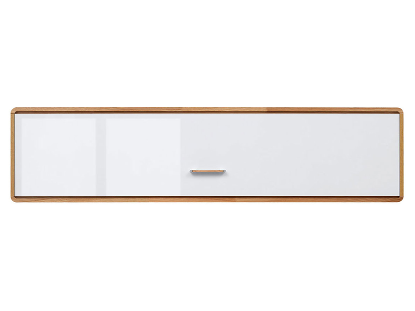 Ett stilrent väggskåp med en högblank vit front och ekdetaljer på kanterna och toppskivan. Väggskåpet är indelad i tre fack som gör det mycket praktisk och kan med fördel hängas över mediabänken i samma möbelserie.