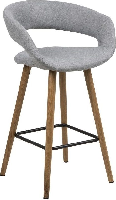 Grace barstol, klädd i behagligt ljusgrått tyg och med oljebehandlade ben av massiv ek med fotstöd av metall. Stolen ingår i vår Grace serie.