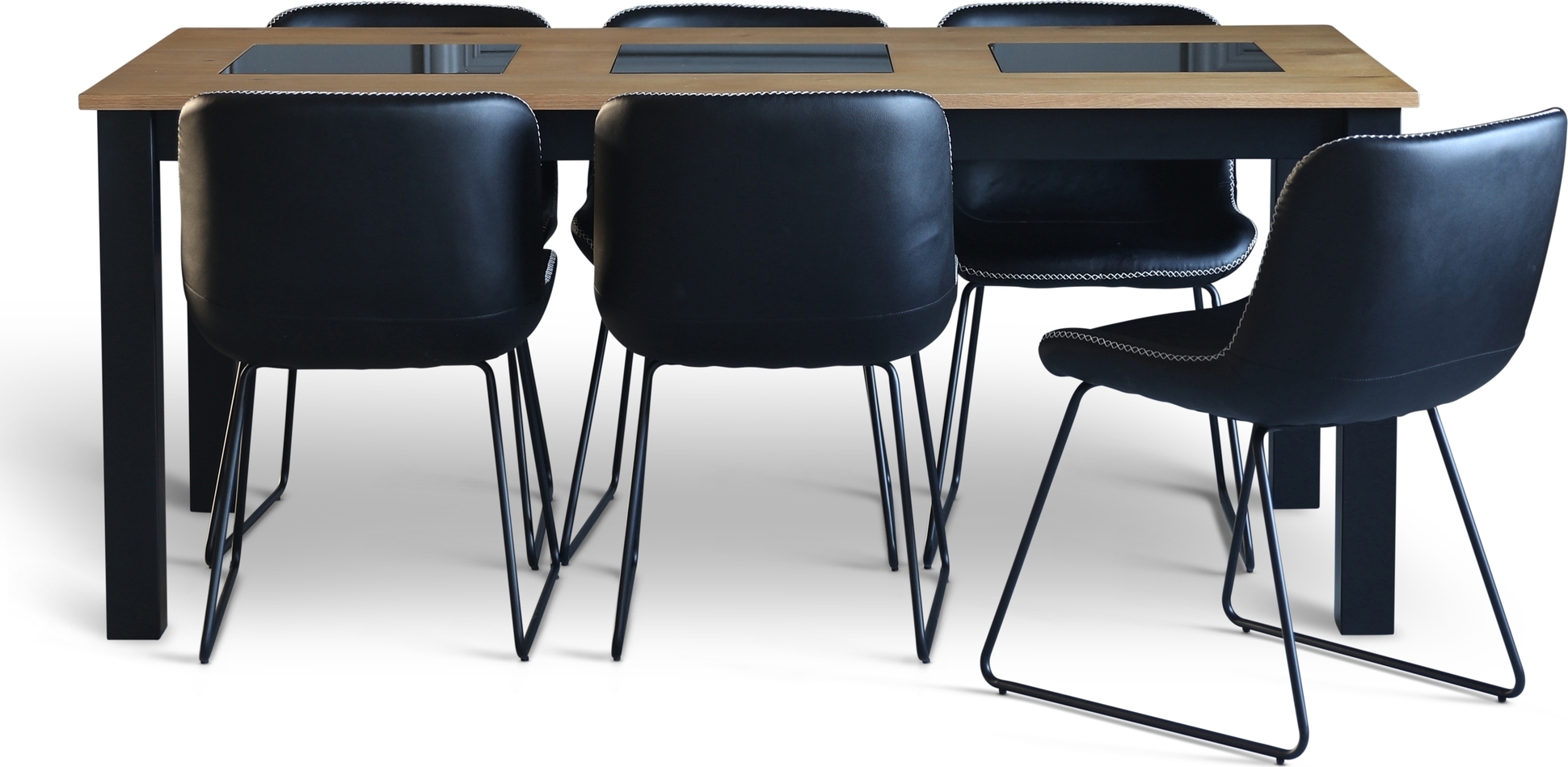 Matgrupp med matbord och 6 st stolar ur serien Texas och Granit. Matbordet är gjort ek och fanèrad ek med svarta glasplattor. Stolarna är gjorda av metall med klädsel av konstläder(PU).