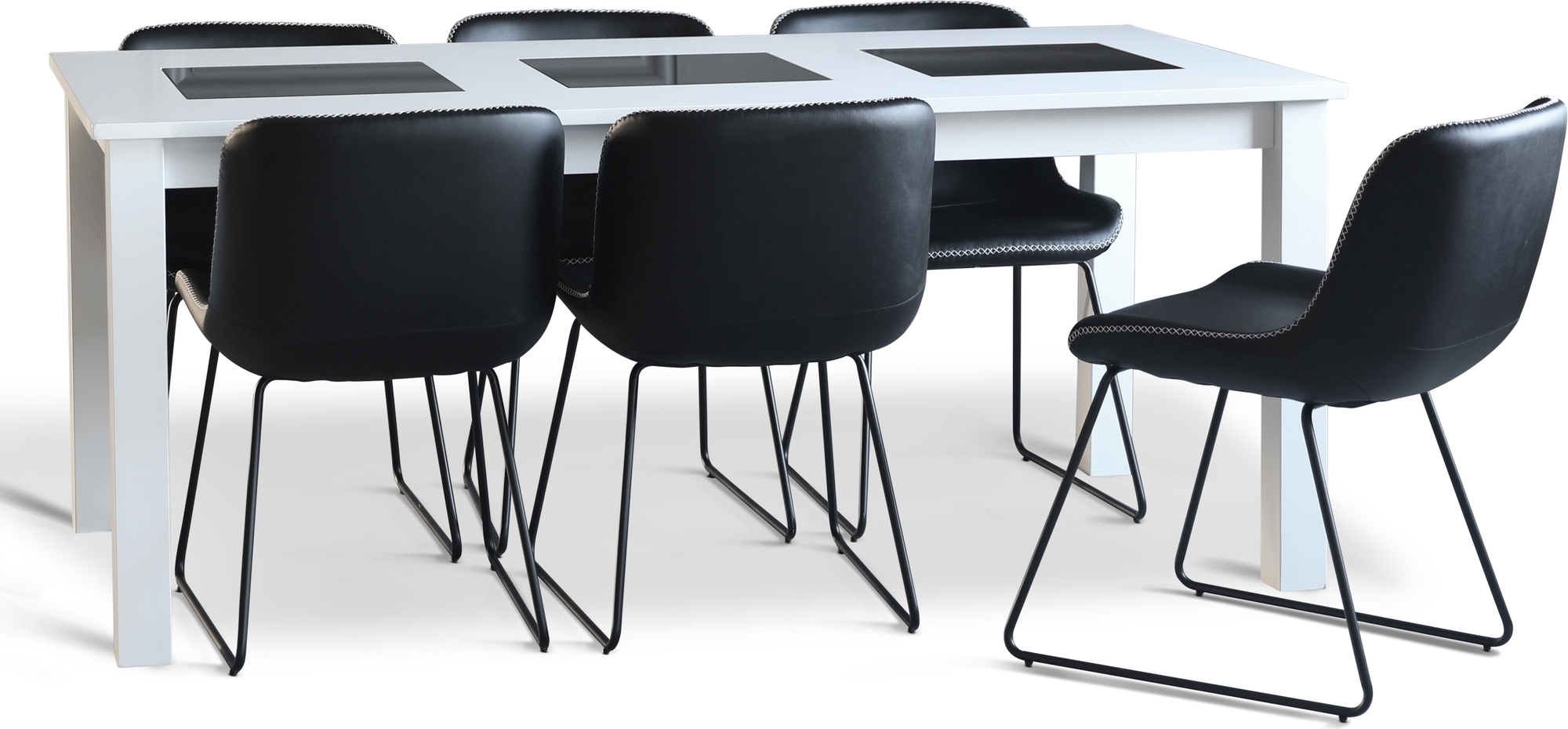 Matgrupp med matbord och 6 st stolar ur serien Texas och Granit. Matbordet är gjort vitlackat trä med svarta glasplattor. Stolarna är gjorda av metall med klädsel av konstläder(PU).