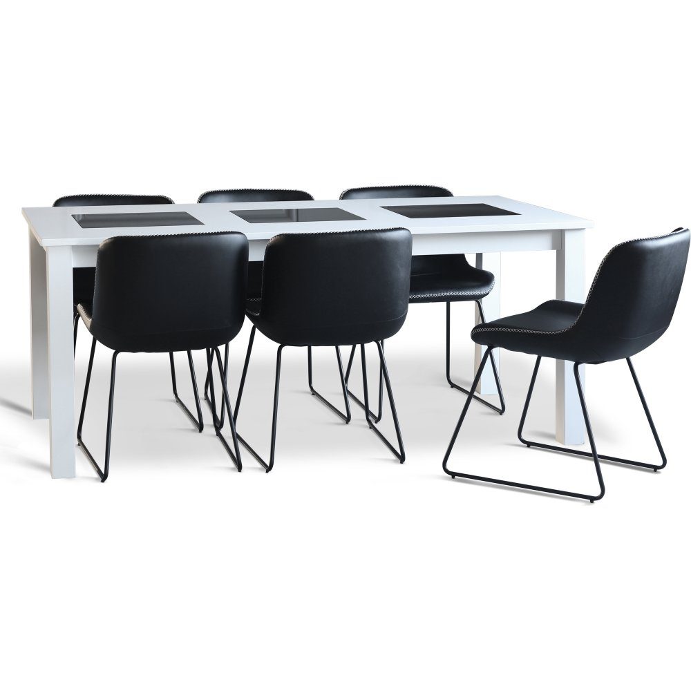 Matgrupp med matbord och 6 st stolar ur serien Texas och Granit. Matbordet är gjort vitlackat trä med svarta glasplattor. Stolarna är gjorda av metall med klädsel av konstläder(PU).