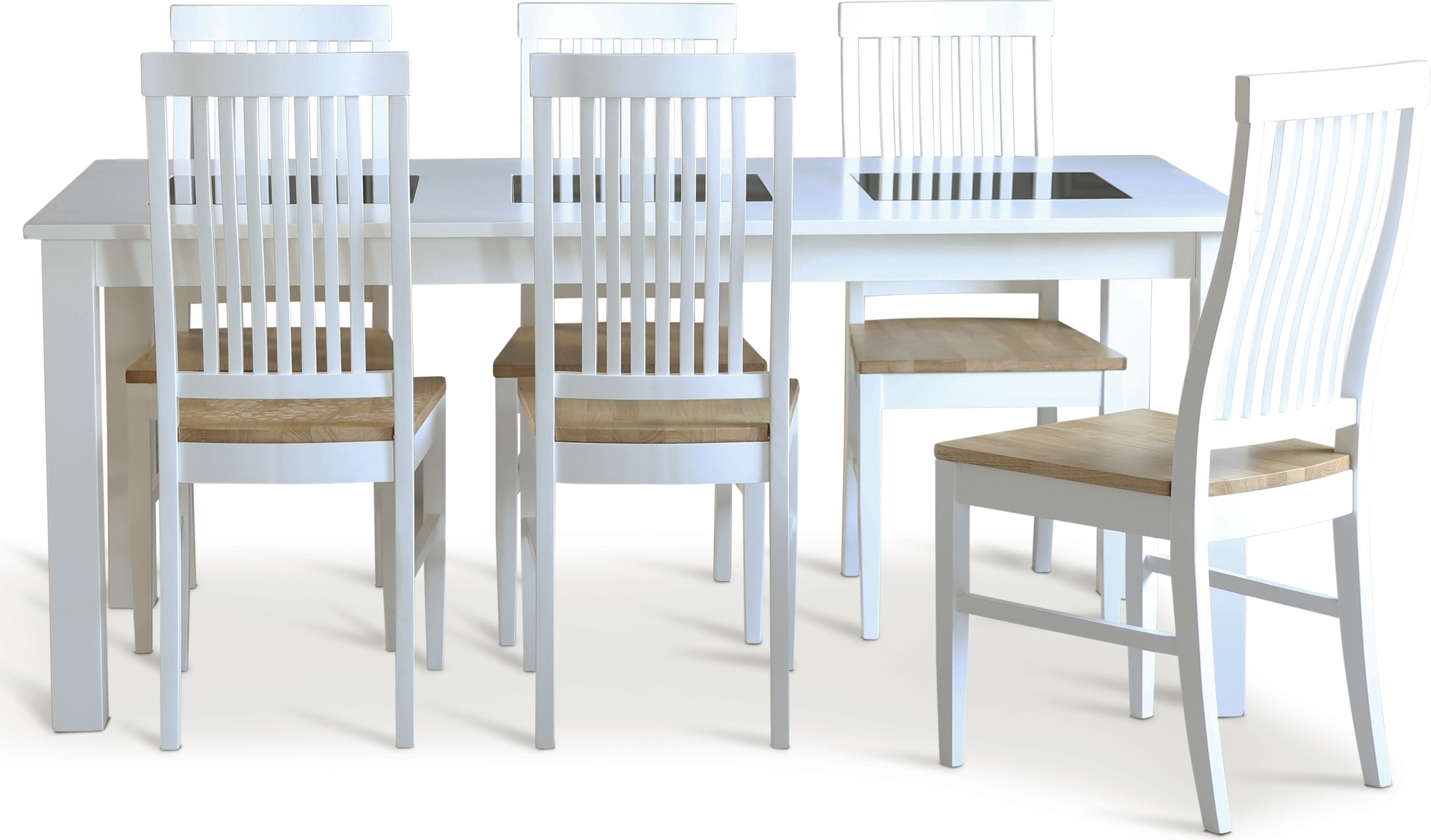Matgrupp med matbord och 6 st stolar ur serien Bow och Granit. Matbordet är gjort vitlackat trä med svarta glasplattor. Stolarna är gjorda i vitlackat trä med ekbetsad sits.