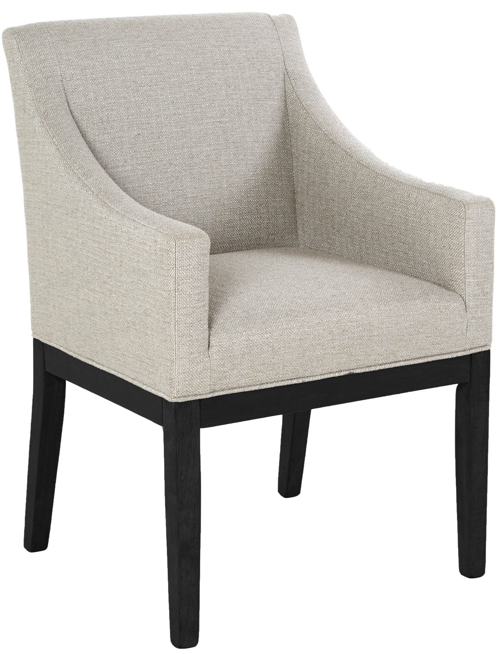 Charmig karmstol i grovt beige tyg och ben av massivt brunt heveaträ.