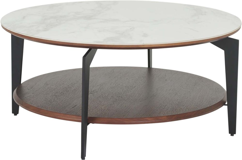 Soffbord i flera färger, ett bord som sticker ut från mängden. Bordet har en toppskiva i keramik och en hylla undertill av valnötsfaner. Benen är av svartlackerad metall.