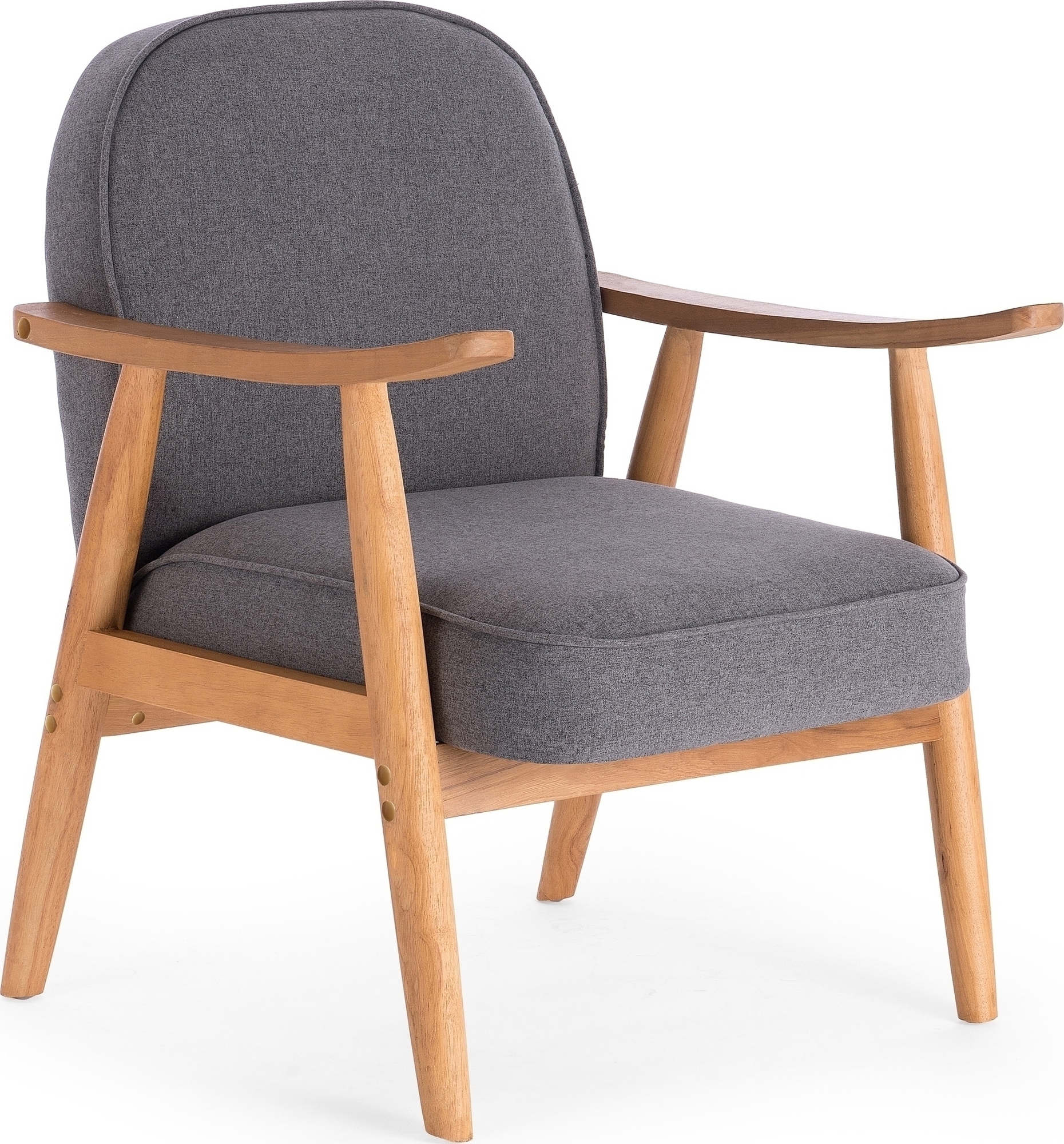En mysig fåtölj med en stilren design. Fåtöljen är tillverkad av solid trä med den naturliga looken på ramen och själva sitsen är klädd med ett mycket behagligt tyg för maximal komfort.