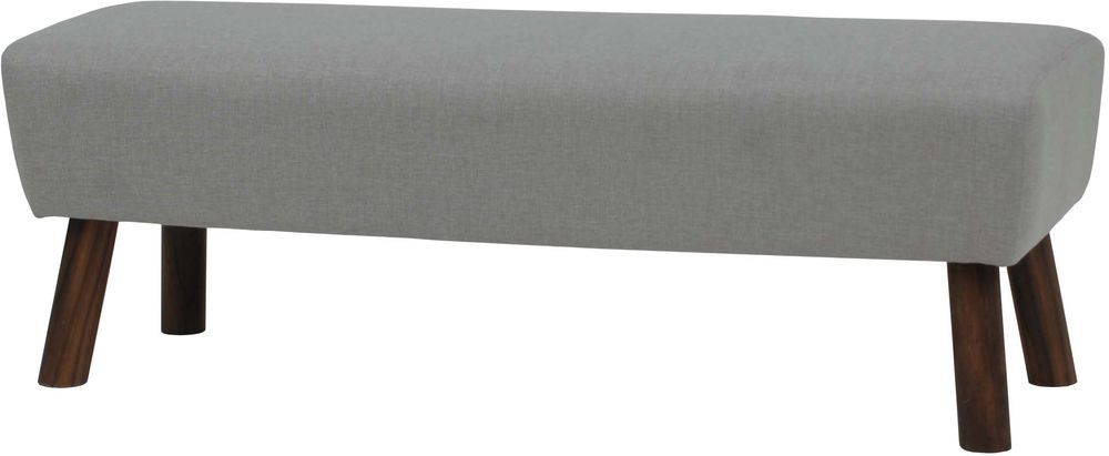 Stilig bänk i beige tyg med runda ben i trä.