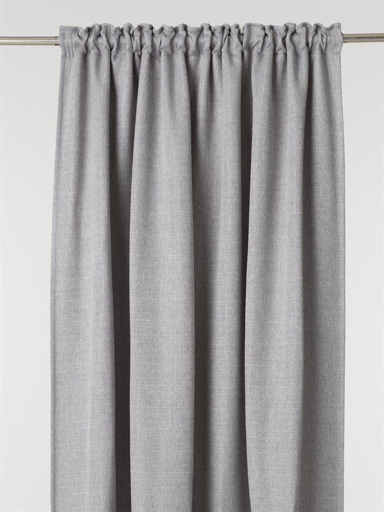 Mörkläggningsgardin tillverkad i polyester. Kommer två stycken längder i en förpackning. Upphängning: multibandslängd som kan hängas upp på tre olika sätt. Med fingerkrokar/ringar på stången eller i hällorna. Fållfix medföljer så man enkelt kan justera längden utan att sy.