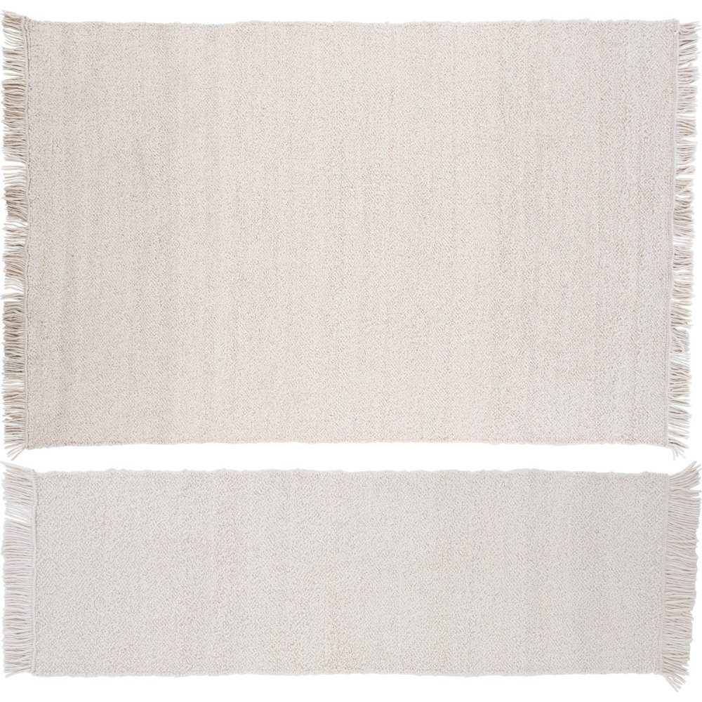 Ullmatta som är handvävd med en teknik som ger mattan en härlig knut-textur. Den vita kulören ger en värme till rummet och den benvita fransraden på kortsidorna blir en läcker detalj.