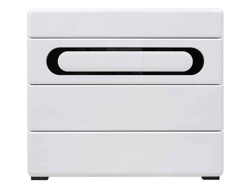 En fin byrå med vit högblank front. Det ellipsformade svarta glaset fungerar som ett handtag men tillför också en känsla av det modernistiska i ditt hem. De resterade lådorna på byrån har inga handtag utan de öppnas med ett lätt tryck.