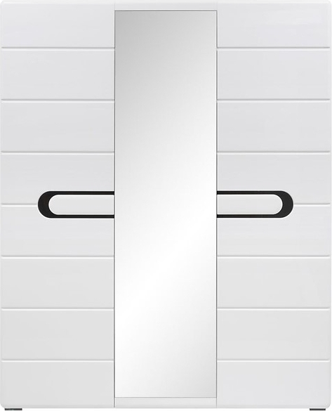 En fin garderob i ek med vita högglansiga dörrar. I mittsektionen finns en praktiskt helkroppsspegel. Det ellipsformade svarta glaset fungerar som ett handtag men är också en fin detalj. Inuti garderoben finns en klädstång och funktionella hyllplan som gör det enkelt att att hålla ordning på dina kläder!