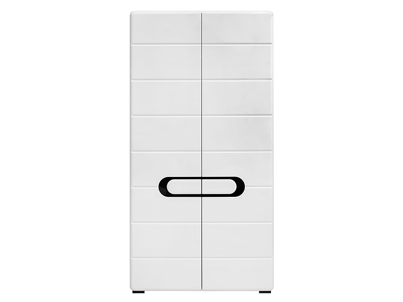 En fin garderob i ek med vita högglansiga dörrar. Det ellipsformade svarta glaset fungerar som ett handtag men är också en fin detalj. Inuti garderoben finns en klädstång med ett hyllplan ovanför som gör det enkelt att att hålla ordning på dina kläder!