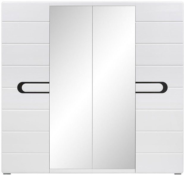 En fin garderob i ek med vita högglansiga dörrar och två dörrar i spegelglas i mittsektionen. Det ellipsformade svarta glaset fungerar som ett handtag men är också en fin detalj. Inuti garderoben finns en klädstång och funktionella hyllplan som gör det enkelt att att hålla ordning på dina kläder!