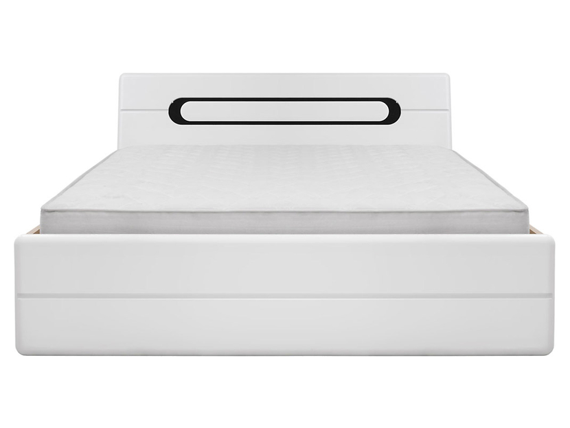 En fin sängram i ek-imitation med vita högglansiga fronter. Det ellipsformade svarta glaset på huvudgaveln ger en känsla av en modern design.