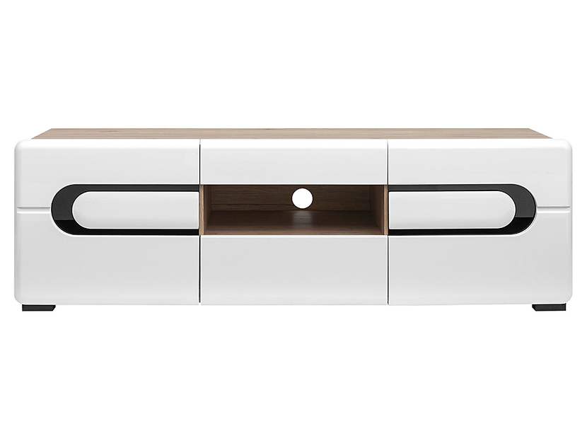 En mediabänk i ek med vita högglansiga fronter. Det ellipsformade svarta glaset fungerar som ett handtag med ger också en modern känsla. Skåpet har två dörrar och två lådor med ett öppet fack i mitten. Inuti skåpet finns det praktiska hyllor för förvaring av din elektroniska utrustning och förborrade hål för dina kablar.