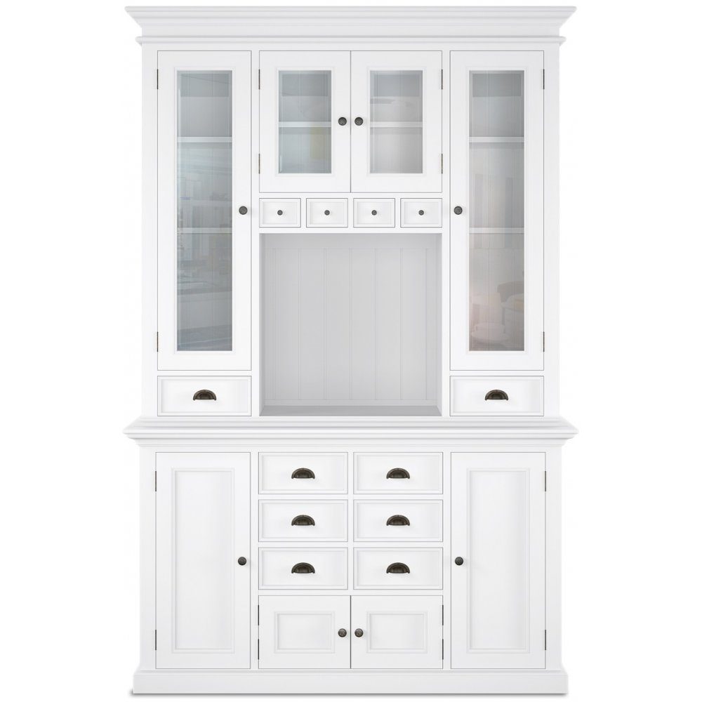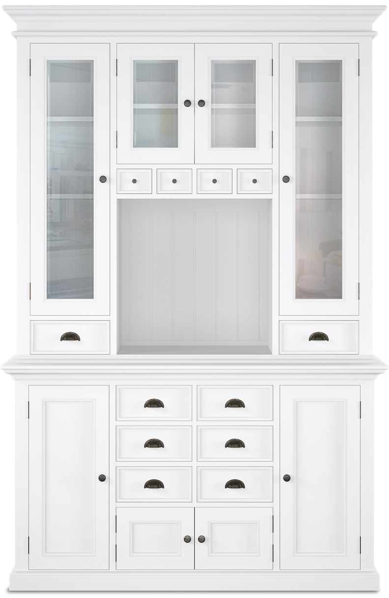 Vår Halifax-serie är en av våra största serier i klassisk stil. Välarbetade detaljer med massivt vitlackat trä. Köksskåpet har mängder med luckor, öppna ytor och lådor för praktisk förvaring. Ett skåp med fantastiska förvaringsmöjligheter. För lätt hantering av inbärning kommer skåpet i underdel och ovandel.
