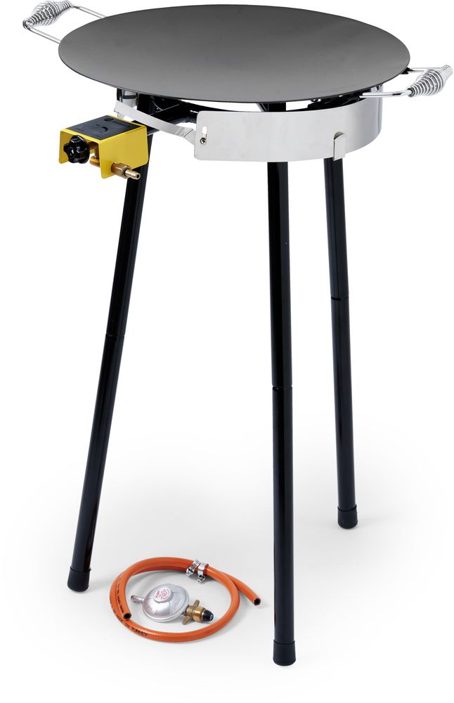 Gasoldriven stekhäll, brännare på 30 cm och stekhäll på 48 cm. Gasolanslutning anpassad för svensk standard. Regulatorsats och vindskydd ingår.