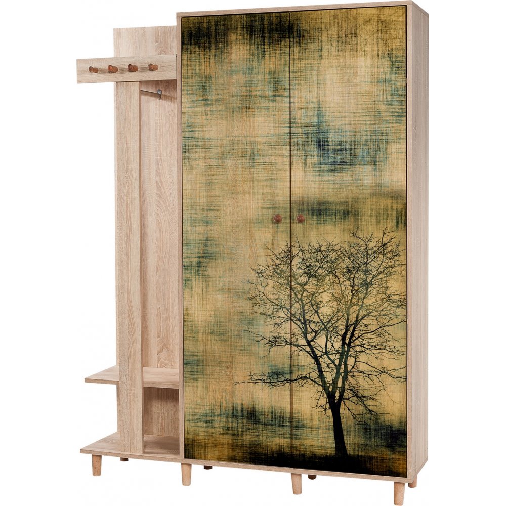 Hallmöbel av melaminbelagd spånskiva. Ben av avenbok. Handtag av metall.