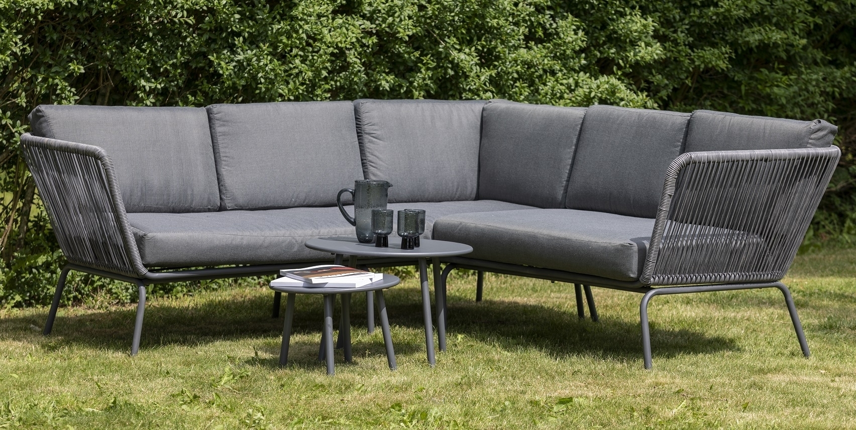 Halmstad utegrupp, soffa och satsbord med stomme i mörkgrå aluminium / konstrotting samt grå sitt- och ryggdynor. De två satsborden kan placeras valfritt på uteplatsen.