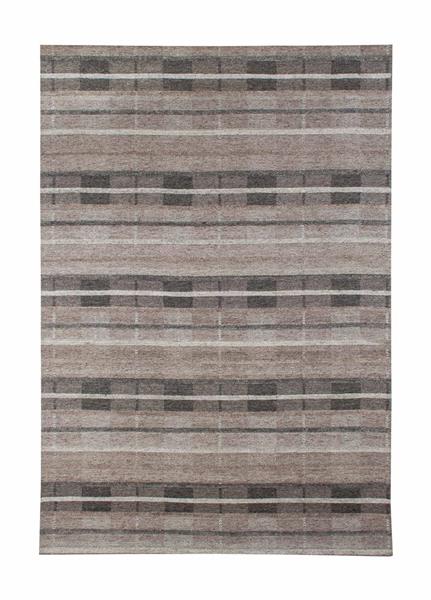 Romano är handvävd i 85% viskos vilket ger en fin lyster. Mattan har olika nyanser i beige och grått, som tillsammans skapar en melerad ton. Eftersom de olika färgblocken i mattan är vävda i olika lugghöjd så skapar det ett randmönster, både vertikalt och horisontellt.