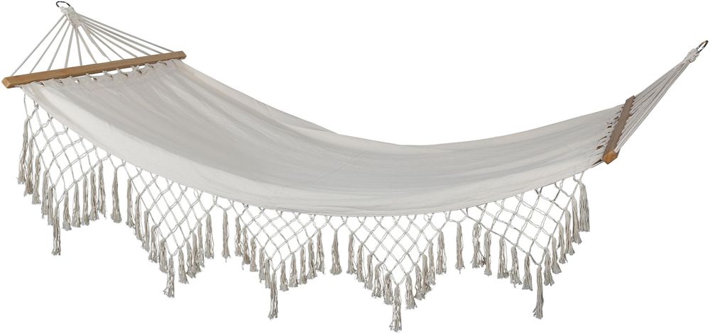 En härlig och kraftfull hängmatta i bomull och polyester med träribbor med naturligt trä utförande och fransar undertill.