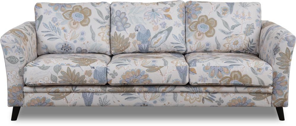 Happy möbelserie är en klassisk modell med välarbetade sitt och ryggdynor som ger bästa möjliga sittkomfort. Stoppningen består av 35kg kallskum med riven polyetertopp. Klädsel av det exklusiva tyger Eden Parrot Beige.