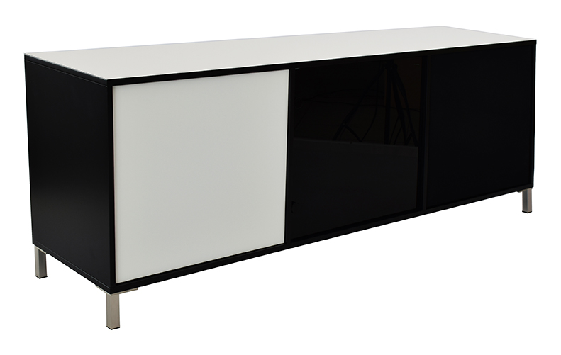 Happy skänk / Sidebord i Svart faner på sidorna med vit laminat topp! En stycken vit dörr, en stycken tonad glasdörr och en stycken dörr som är klädd i Svart tyg. Stilrena metallben.