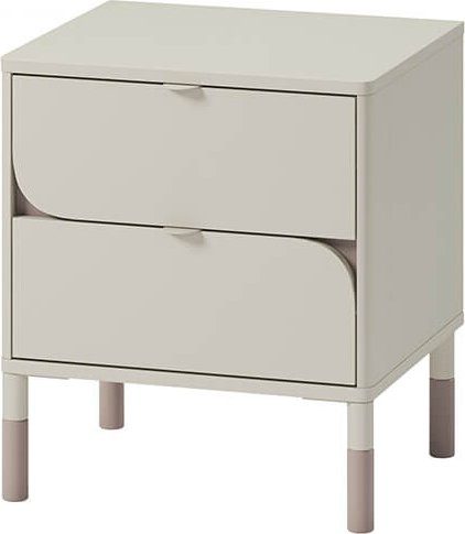 Sängbord av laminerad spånskiva med ben av metall och handtag av plast. Levereras omonterad.