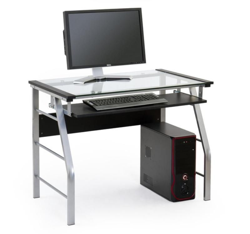 Snyggt skrivbord med en modern design. Underredet är i kromad metall med en snygg design och bordsskivan är i klarglas med en praktisk utdragbar underhylla för placering av tangentbord och mus.