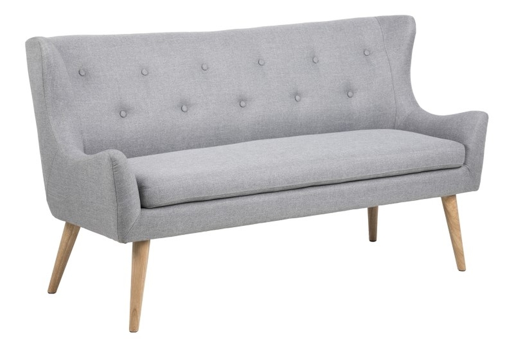 Klassiskt designad soffa med bekvämt ljusgrått tyg och oljebehandlade ben gjorda av gummiträ. Ett bra tillval till hushållet.